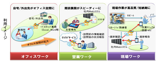 これにより、オフィスワークだけでなく、営業ワーク、さらには接客や工事などの現場でも活用できる新しいワークスタイルが実現できます。