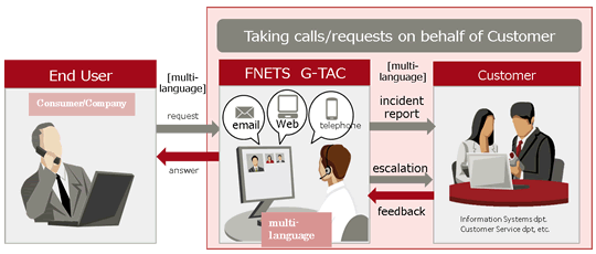 FNETS has experience in providing a number of services supporting multivendor ICT infrastructure in multiple languages, mainly for communication-services providers and global data centers across the globe in more than 50 countries by "G-TAC" located in the headquarter. In order to help customers solve above mentioned problems, based on the know-hows accumulated through G-TAC, FNETS newly offers the "Global Help Desk" that can respond to the needs not only of such companies but also their customers.