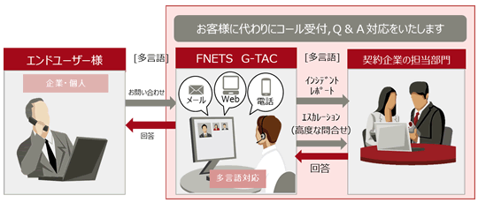 FNETSでは、従来より本社内に拠点を置く「G-TAC」にて、50カ国以上にわたり、通信プロバイダーやグローバルデータセンターを中心に多言語でマルチベンダーのICTインフラをサポートするサービスを多数提供してきました。今回、上記のような企業のお客様の課題を解決するために、G-TACで培ったノウハウを基に企業のみならず個人のお客様からのお問い合わせにも 対応する「グローバルヘルプデスク」サービスを新たに提供します。