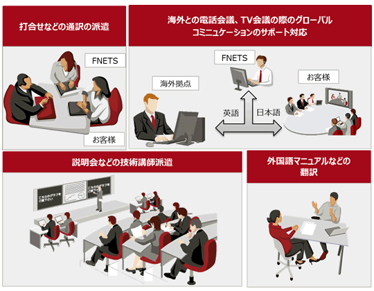 - 通訳やメール・文書・Webサイトの翻訳、技術講師派遣サービスを提供します。