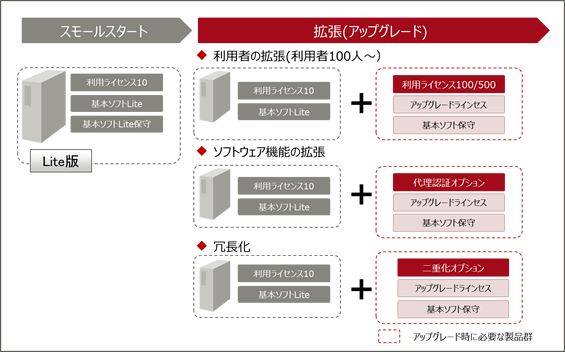さらに、Lite版で標準搭載されていない「代理認証オプション」と「二重化オプション」を追加するなどソフトウェア機能の拡張や冗長化などが可能になります。