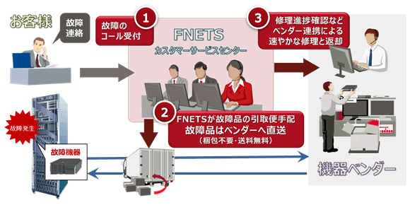 ※修理ができない場合には、代替品を提供します。同一製品の入手が困難な場合には、同等機種をもって代替品とする場合があります。また代替品を提供した場合は、その対象機器に対する本サービスは終了となります。 - マルチベンダーであっても問い合わせ窓口はFNETSへ一本化