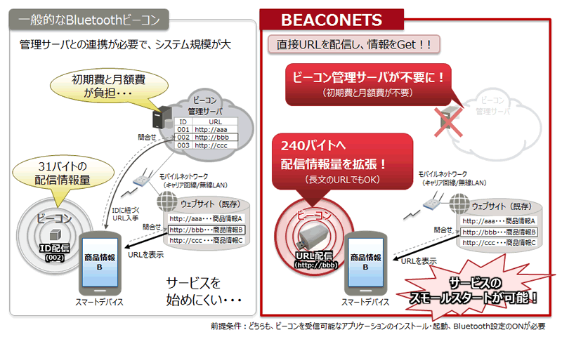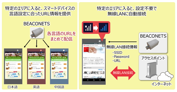Bluetooth通信を活用した一般的なビーコンと比較して、情報配信量を31バイトから240バイトに拡張したことで管理サーバを必要とせず、ビーコン発信器単体からURLや無線LAN接続に必要な情報(SSID、セキュリティキー)や、短いメッセージ文を直接配信することができます。これにより、アプリケーションを起動していれば限定エリアに近づくだけで、SSIDやセキュリティキーの入力をすることなく自動的に無線LANに接続され、必要な情報を受信することができます。