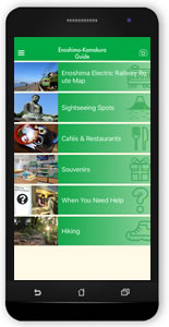 「Enoshima-Kamakura Guide」は訪日外国人観光客向けのスマートデバイス用多言語観光アプリで、江ノ電沿線とその周辺の観光スポット、飲食店エリア、土産物販売所、外国人観光客に役立つ便利な情報等を多言語で表示します。Google PlayまたはApp Storeからスマートデバイスにダウンロードすることで利用でき、対応言語は英語・中国語(繁体字・簡体字)・フランス語・スペイン語の4か国語です。