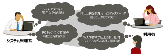 2020年1月のWindows 7延長サポート終了( 注3 )を前に、パソコンのリプレースに合わせたWindows 10の導入が増えていますが、導入後のWindows Updateによる更新プログラムの大容量化や、トラフィック急増による業務への影響が大きな課題となり、対策が求められています。