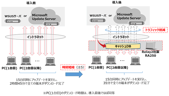 | (注5) | 時間短縮:上位回線の帯域が60Mbpsの環境で、約4GBのアップデートファイルを15台のPCでダウンロードした時間を測定。(本条件下の実測値であり、環境・条件により変動します) |