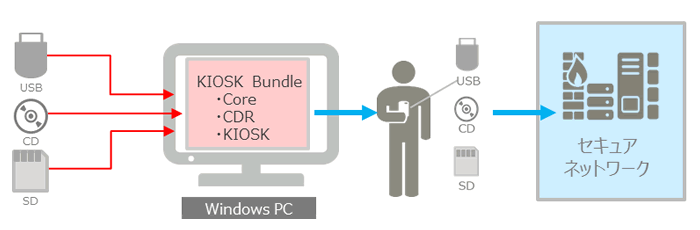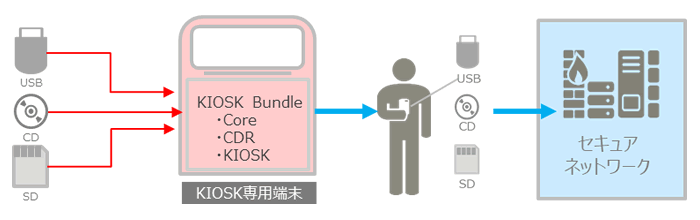 可搬型記憶媒体を持ち込む利用者は、可搬型記憶媒体をKIOSK筐体に挿入しタッチパネルによる直感操作での検疫のため、利用者や管理者の負荷を軽減します。(PCでの導入も可能です。)