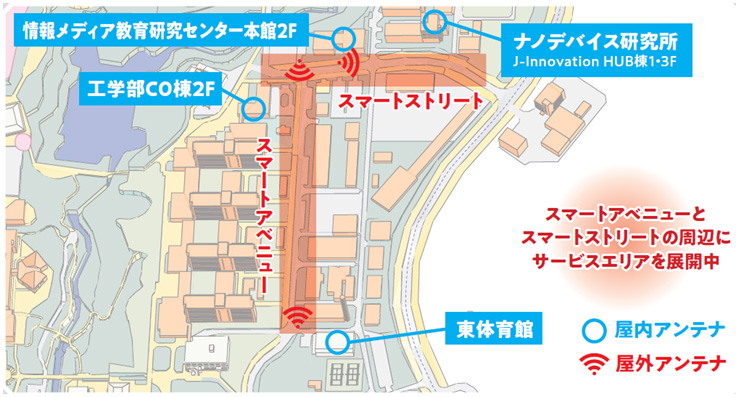 今回構築するローカル5Gシステムは、スタンドアローン方式を採用しており、東広島キャンパス内の7ヵ所(屋内×4ヵ所/屋外×3ヶ所)にアンテナを整備いたします。