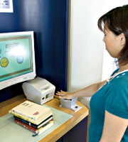 「銀行の場合はパスワードに代わるセキュリティ強化という面で採用されたかと思いますが、それを本人確認の手段として使えないかと生体認証に着目しました。ただ、生体認証もいろいろあり、図書館にとって採用しにくいもの・・たとえば虹彩認証、装置が大きく高価なものは難しい。筆跡や声紋になりますと窓口に来て書いてもらったり、声を出すものは不向きであると思いました。そこで静脈であれば図書館に向くのではないかとさらに検証を進めました。2005年当時、生体認証をセキュリティ強化ではなく本人確認の手段として使いたいという我々の要望に「やってみましょう」と回答を頂いたのが富士通さんの手のひら静脈認証でした」
