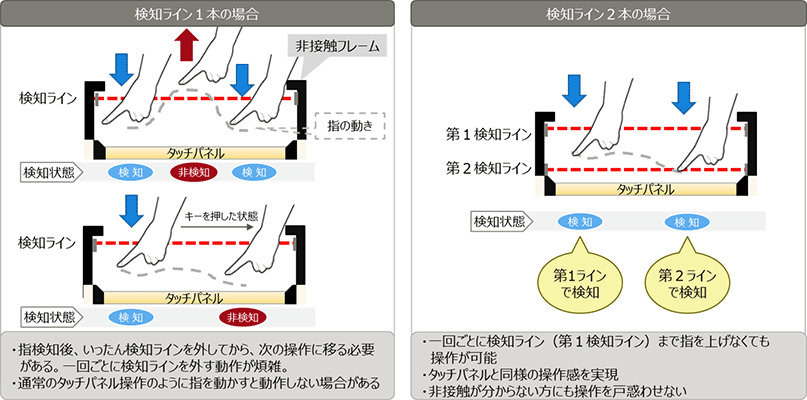 - フレームには、上下2段階に指を検知するセンサーがついています。第一検知ラインに加えて、第二検知ラインでも指の動きを検知できるため、操作時にフレームから大きく手を上部へ離す動作が不要で、自然な操作感を実現しています。(図参照)