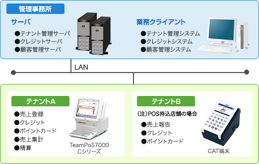 ショッピングセンターのCAT端末として、売上報告・各種決済・ポイント管理業務を行えます。