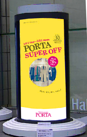 当社は、横浜新都市センター株式会社様運営の横浜駅に隣接するショッピングセンター「横浜ポルタ」(所在地:神奈川県横浜市、以下、横浜ポルタ)様が、2011年新春のクリアランスセールなど広告インフォメーション展開に次世代型曲面ビジョン「プラズマチューブアレイ」(PTA)(注1)をご利用いただきます。 ショッピングセンターにおける曲面表示デジタルサイネージ(注2)として、初のご利用となります。