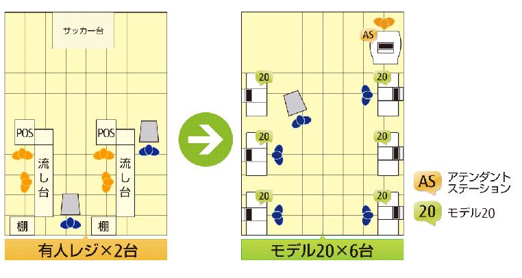 2)装置構造の見直しにより、設置スペースでは約30%削減しました。有人レジ2台のスペースに、従来のセルフレジでは4台設置のところ、モデル20では 6台設置可能です。有人レジ2台の場合と比較してレジ効率を1.5倍(当社試算)に改善でき、お客様のレジ待ち時間を短縮できます。