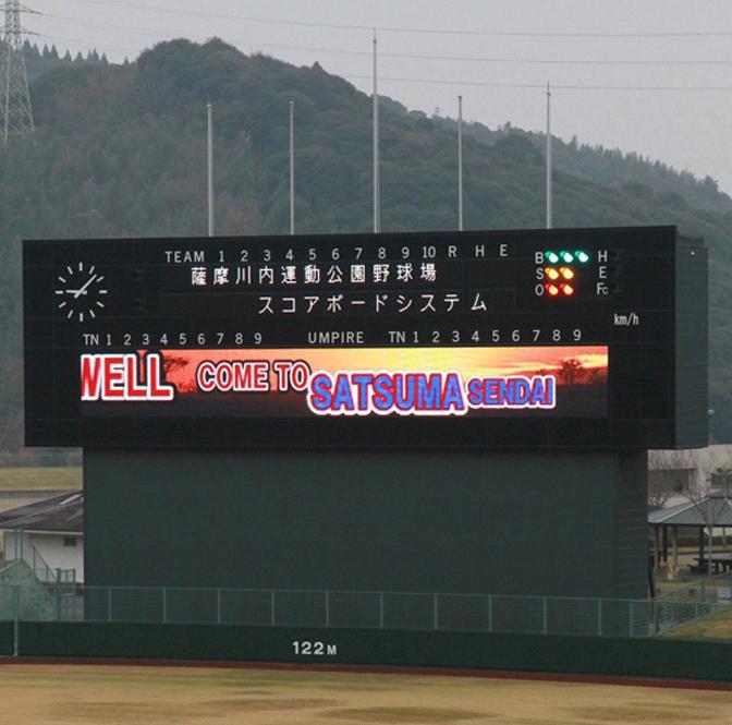 今回、スコアボードを導入いただいた薩摩川内市様 総合運動公園野球場は、県内外から年間約30万人の方が利用する総合運動公園内にあり、このたび、設備の老朽化に伴い改修が行われ、当社製"フルカラーLEDスコアボード"をご採用いただきました。本装置の採用により、"ホームランなどの演出効果"、"地域の観光案内のお知らせ"などのメッセージを文字と映像(動画・静止画)を、盛り込んで表現することができます。また、いち早く、ボールカウントを『BSO』式とし、スピードガンによる球速表示も導入するなど、サービスの向上を図っています。