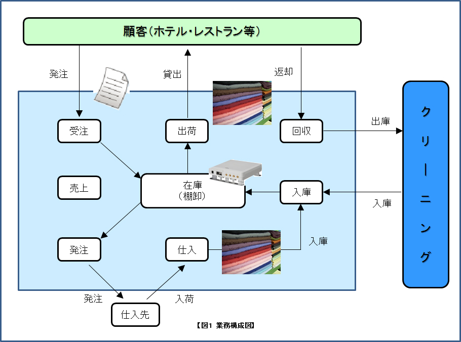 ワールドサービスは、テーブルクロス等のパーティー用品を、ホテル、レストラン等(取引社数1000社)にレンタルすることを主業務としています。お客様から注文のあったレンタル品を納入し、ご利用いただいた後に回収して、クリーニングを行い保管するというサイクルの業務を行っておりますが、従来の在庫管理や回収処理、出荷処理等は、すべて手作業による管理であったため、以下の課題がありました。