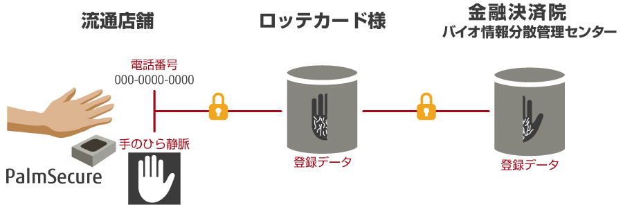 手のひら静脈認証装置「PalmSecure™」は、手のひらの静脈情報をイメージの形態で保存するのではなく、静脈のパターン情報を解読が不可能なデータに変換したうえで暗号化します。ロッテカード様の「Hand Pay サービス」のシステムでは、暗号化されたデータを韓国 金融決済院様のバイオ情報分散管理センターとロッテカード様のシステム環境に分散保存したことで、セキュリティをより強化しました。