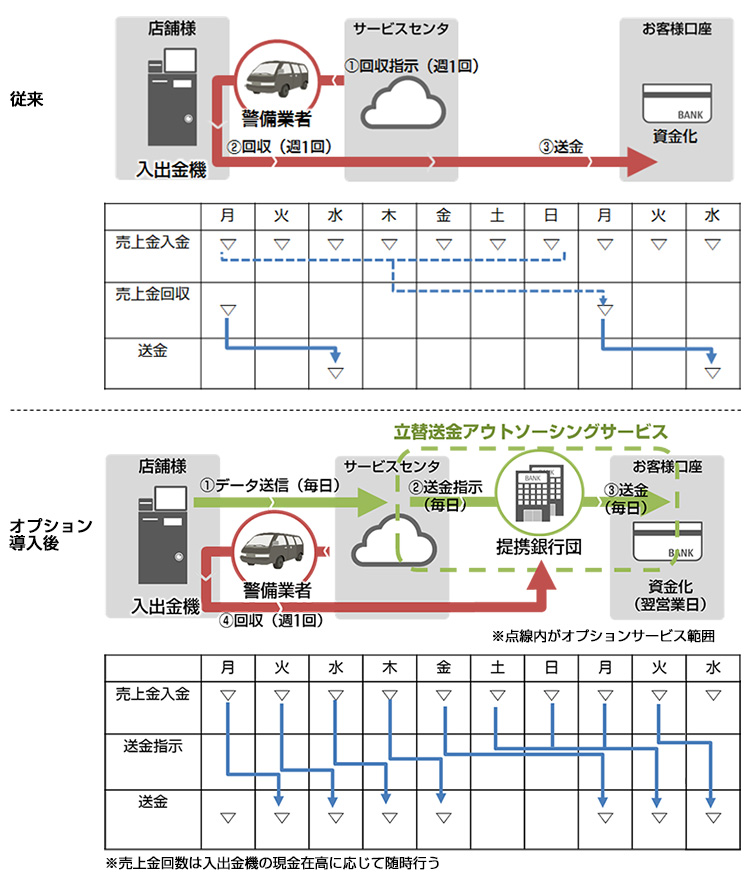 本オプションサービスでは、当社が新たに複数の銀行と提携して構築した早期資金化のスキームを活用し、店舗などに設置した入出金機に売上金として登録されたデータを基に、最短で翌日(銀行営業日)、提携銀行が立替え送金を行うサービスです。