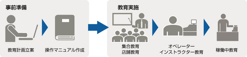 - オンサイト教育:POS稼働に立会い、OJT形式で教育を実施いたします。