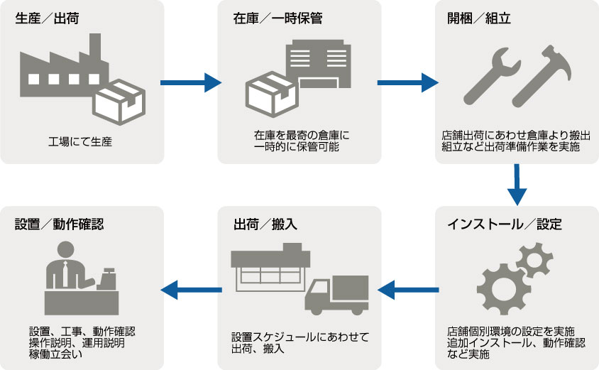 POSは組立済み、設定済みで店舗へ搬入。店舗での作業内容が軽減され効率的な店舗展開が図れます。