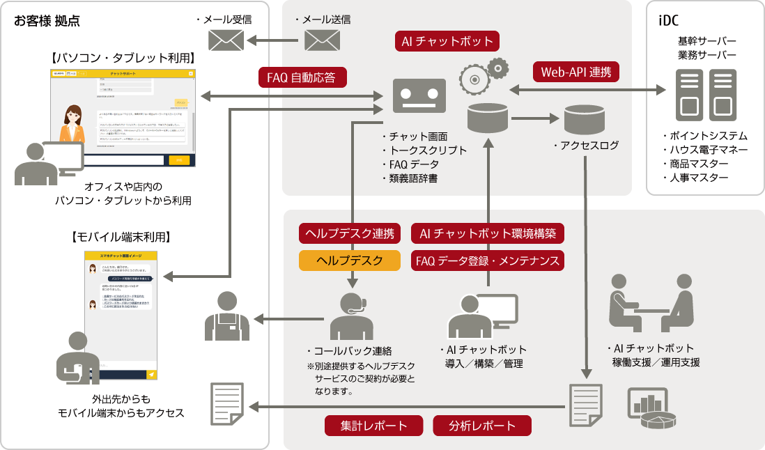 AIチャットボットだけで問い合わせが解決できない場合に、ヘルプデスクサービス(注)のオペレーターへ問い合わせ対応を引き継ぎます。