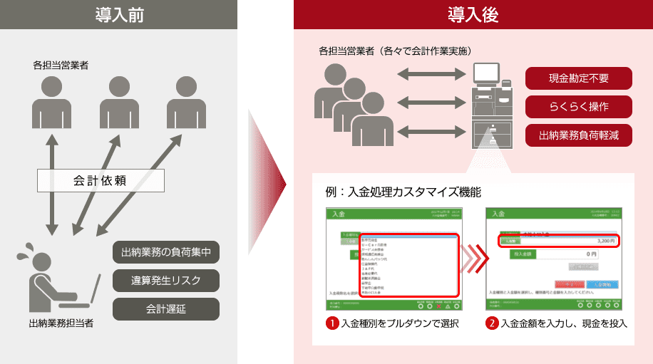 営業担当が出納担当者に都度会計依頼をするような流れだと、依頼の手間がかかりますし、出納担当者に業務負荷が集中してしまうといった課題があります。そこで営業担当の各々が入出金機を使って会計作業を直接実施できるようにします。
