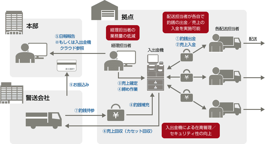 そうしたサービスにおいても、拠点に入出金機を設置し、配達員、販売員が釣銭の出金や売上の入金を各自で実施できるようにするのはTeamCloud/CMの役目となります。