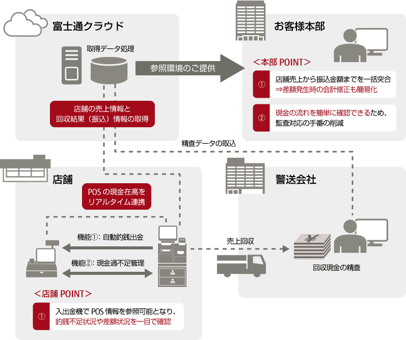 また、こちらの薬局チェーンでは、入出金機からクラウドに送られたデータを、お客様の本部システムからも参照できるようにしています。店舗売上から振込金額までを一括突合できるようになり、差額発生時の会計修正も簡易化できるようになりました。現金の流れが簡単に把握できるため、例えば監査時の確認もスムーズに行えるようになりました。