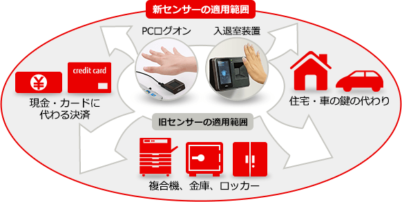 従来はPCログオンや入退室装置での使用が中心でしたが、複合機や金庫・ロッカーなどでの使用が拡大することで、企業内の認証方式を手のひら静脈認証に統一できます。また、現金やクレジットカードに代わる手ぶらでの決済手段や、住宅やクルマの鍵の代替など、利用シーンを新たな市場へ拡大します。
