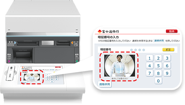 既存顧客カメラを用い、取引画面(暗証番号入力画面)に利用者の背後画像を表示。