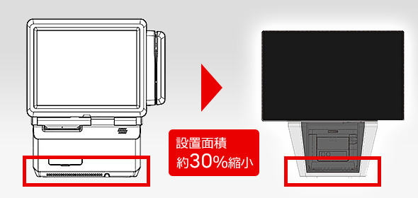 従来機種(TeamPoS7000モデルC240)と比較し、約30%設置面積縮小。