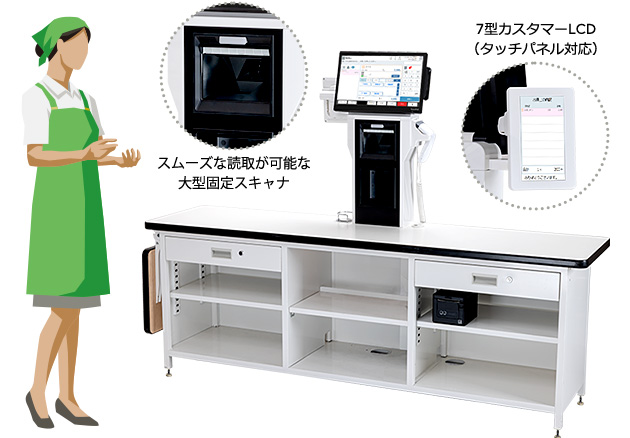 - 大型固定スキャナにより、購買点数が多くてもスムーズなスキャンが可能です。