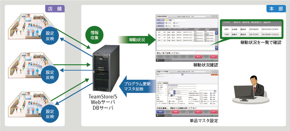 本部で全店分の各種マスタの設定や、POS稼動状況の確認などが可能です。