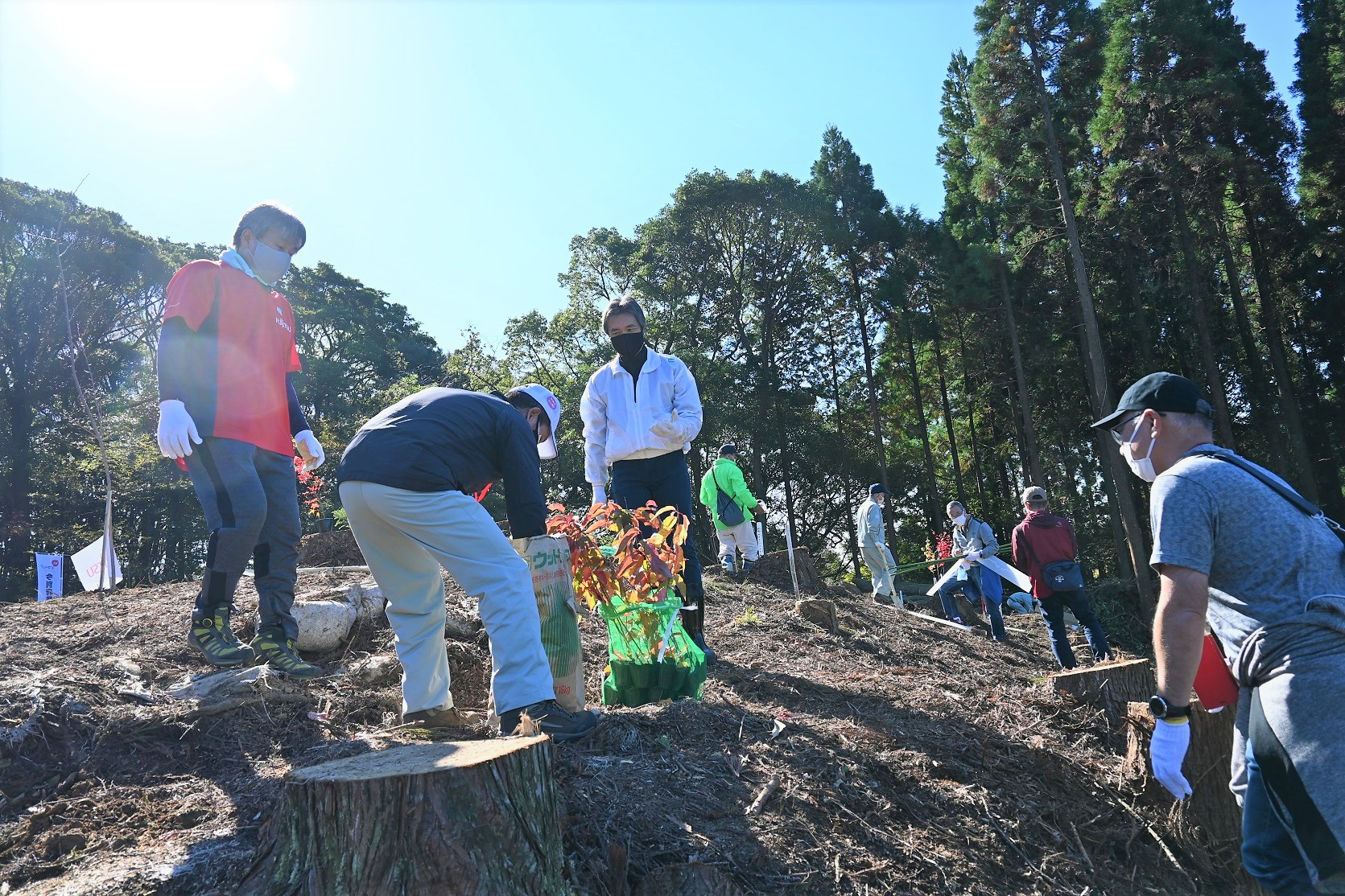 今年は、新型コロナウイルス感染拡大防止に配慮したうえで、協賛企業や緑の少年団・森林ボランティア団体などからの参加人数も少数に制限しての開催となりましたが、参加者の手でヤマザクラやイロハモミジなどの苗木が植栽されました。