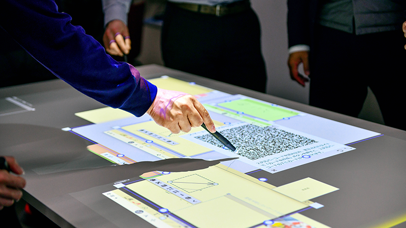 この製品は、プロジェクタ投影面に電子ペンを使ってデジタル付箋を発行したり、スマートフォンとQRコードで連携して写真を読み込ませたりすることができます。