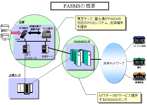 株式会社NTTデータ(本社:東京都江東区豊洲、代表取締役社長:青木利晴、以下:NTTデータ)、東芝テック株式会社(本社:東京都千代田区神田錦町、代表取締役社長:森健一、以下:東芝テック)、富士通株式会社(本社:東京都千代田区丸の内、代表取締役社長:秋草直之、以下:富士通)の3社は、店舗における多様なカードサービスを迅速、容易に実現するカードソリューションサービス「PASMS(パスムズ)」を平成12年10月から提供いたします。