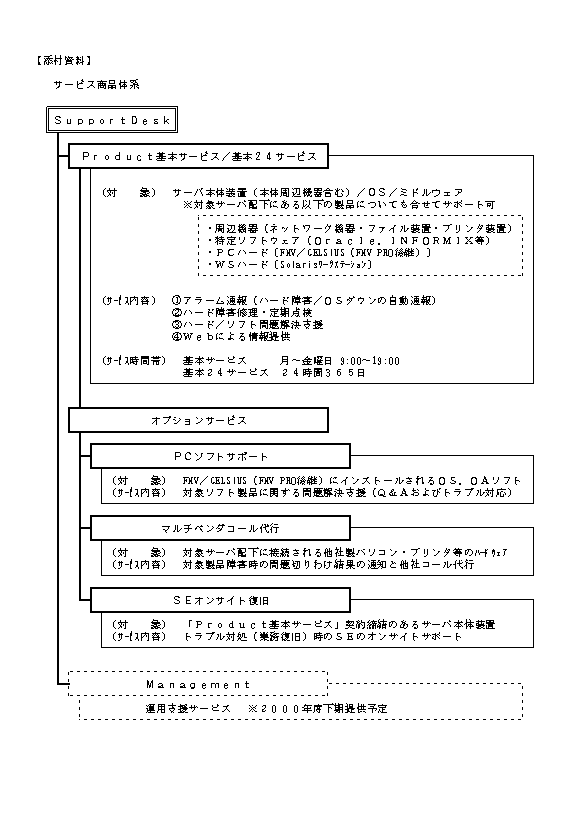 今回第一弾として、「SupportDesk Productサービス」を提供いたします。本サービスは、リモートサポート機構を搭載したサーバ製品のハードウェア/ソフトウェアを中心にクライアントパソコン、周辺機器を含めたシステム全体のサポートを行います。