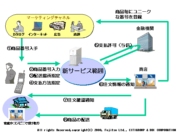 このほど、富士通株式会社(社長 秋草直之)、シティグループ(会長 Sandy Weill)、第二電電株式会社(社長 奧山雄材)は、携帯電話を利用してショッピングし、同時に決済を行う新たなサービスを共同で提供することと致しました。