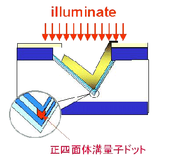 この量子ドットに光を照射した場合、1対の電子と正孔が生成されますが、電子は量子ドットから流出し正孔だけがこの量子ドットに残るため、電荷を蓄積することができます。すなわち、光書込みによるメモリ動作が可能です。また、量子ドットのエネルギー準位が結晶成長によって制御可能なため、この動作を光の波長で選択できます。さらに、正四面体側壁の量子井戸層を受光面として使うことにより、受光面積を増やしたり、入射光と井戸層とが予め角度を持つために相互作用が強まるなど、感度の向上が期待できます。