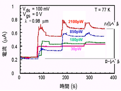 試作品を評価した結果、77Kの温度下において、量子ドットに蓄積する電荷数の制御が電圧によっても光によっても可能であることを、確認しました。これにより、将来の蓄積電荷数制御による多値メモリや電子−光融合素子実現に一歩近づいたと考えております。