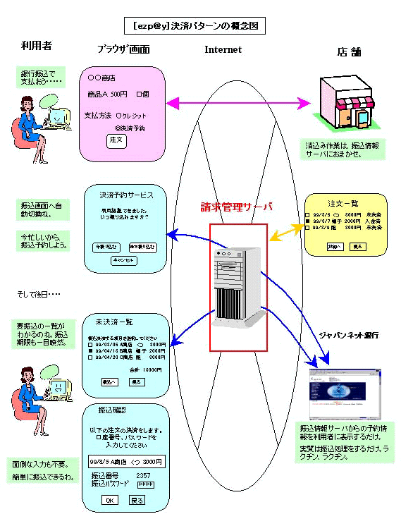 「ezp@y」は、インターネット上でのショッピング代金等の決済を、シームレスに且つ極めて簡便に行える、銀行振込を基本にした新たな決済サービスです。また、利用者に対しては決済、未決済情報を一覧で閲覧できる等従来にはない付加機能を提供いたします。