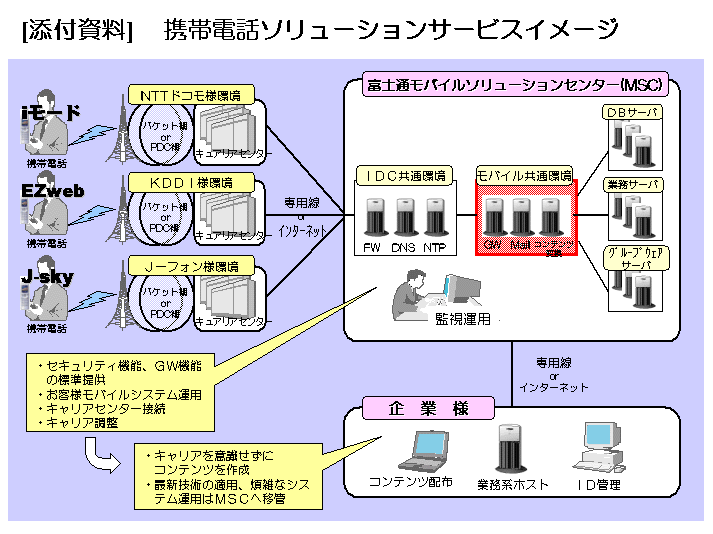 - キャリア殿接続機能、コンテンツ変換機能を含め、お客様のモバイルシステムを稼動させるMSCは、国内最高水準の規模と信頼性を誇る富士通インターネットデータセンター内に設置。安全性への配慮やセキュリティ確保を含め、お客様はモバイルシステム運用業務から開放されます。