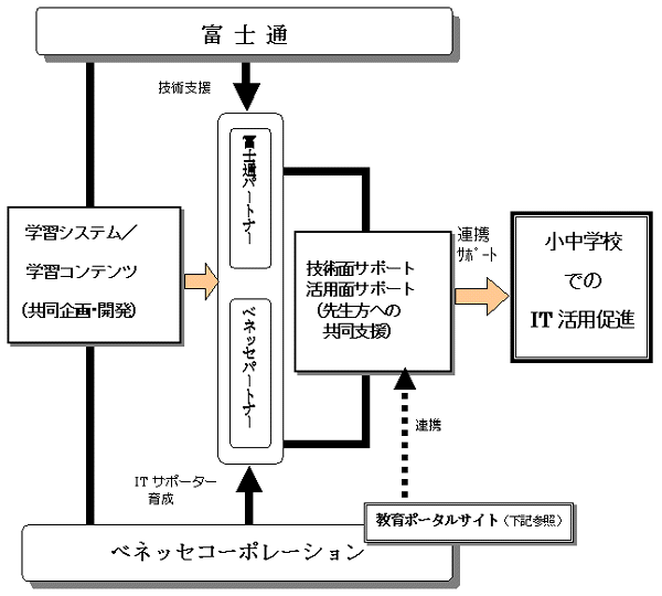 株式会社ベネッセコーポレーション(以下、ベネッセ)と 富士通株式会社(以下、富士通)は、学校の教育現場におけるIT活用支援事業を、2001年4月より共同で展開します。これは、政府が教育の情報化事業として全国の小中高校にコンピュータやインターネット環境を導入する動きに合わせたもので、IT(情報技術)と教育関連の企業同士が協業体制で学校現場を支援するのは新しい取り組みです。