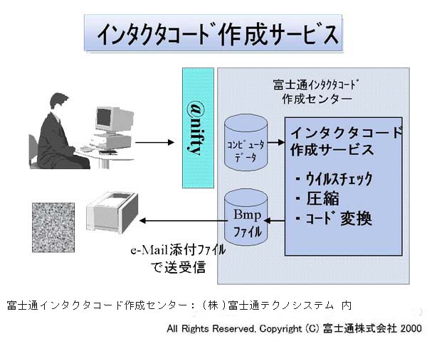 「INTACTA CENTER」は、声/音楽、写真やビデオなどの画像、ワープロソフトや表計算ソフトなどのOAデータといったあらゆるコンピュータデータを、インターネットで受け付けて、米国ITI社 *が開発した独自のドットパターンのインタクタコードに変換し、即時にEメールで返送するサービスです。