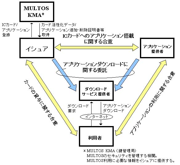 ICカードへのアプリケーションダウンロード実証実験の実施についてNTTコミュニケーションズ株式会社(以下:NTT Com、所在地:東京都千代田区、代表取締役社長:鈴木正誠)、株式会社日立製作所(以下:日立製作所、所在地:東京都千代田区、取締役社長:庄山悦彦)、大日本印刷株式会社(以下:DNP、所在地:東京都新宿区、代表取締役社長:北島義俊)、富士通株式会社(以下:富士通、所在地:東京都千代田区、代表取締役社長: 秋草直之)及びマルトス推進協議会(*1)は、発行済みのICカードに対して新しいアプリケーションを追加する際に、インターネットを介して当該アプリケーションをダウンロードするシステムを開発し、その実証実験を本年7月2日から実施します。本実証実験で使用するICカードのOSはMULTOS(*2)を対象としています。MULTOSは、1枚のICカードに複数のアプリケーションを搭載することが可能な世界標準のICカードOSであり、日本においてもその発行実績を着実に増やしています。 4社とマルトス推進協議会は、本実証実験の成果をMULTOSのアプリケーションダウンロード標準方式として、日本のみならず世界に向け、普及・発展させる計画です。 1.開発したシステムの特徴 (1) 多様なビジネススキームに対応 ICカードを発行する事業者(イシュア)と、アプリケーションを提供する事業者が異なる場合(図参照)でも対応可能です。 これにより、イシュアとアプリケーション提供者とのビジネス分業が可能となり、ICカードを利用したビジネスの展開が行い易くなります。 (2) インターネット経由のダウンロード ICカードへのアプリケーションの追加・削除がインターネットを利用して安全に行えます。 これにより、利用者がイシュアの店舗等特定の場所に出向く必要なく、家庭・職場等でのダウンロードが可能となることから、利用者の利便性が著しく向上します。 (3) MULTOS規約等の実用システムへの組み込み MULTOS OSを用いる場合、ICカードのセキュリティの維持のため、世界的に統一されたカード発行規則、アプリケーションの搭載管理規則等を遵守する必要があります。 本実証実験では、これらの規則を実際のICカード発行システム、認証システム、アプリケーションダウンロードシステムに組み込み、イシュア、アプリケーション提供者にMULTOSの専門知識がなくても運用可能とした、極めて実用性の高いシステム構成となっています。 2.実証実験の概要 本システムの検証を行うため、以下のとおり実証実験を実施します。