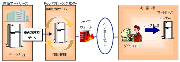 住商オートリースにて車両カタログデータの作成および更新を行い、Fsolのアウトソーシングセンターにて運用管理し、インターネット経由でお客様にデータを提供します。