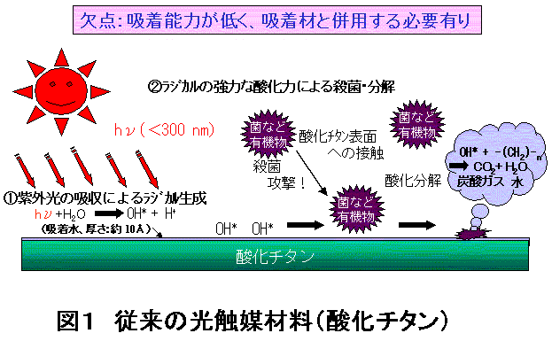 この問題を解決するため、酸化チタン光触媒が注目されています。これは、クリーンエネルギーである紫外領域の光を用い、臭い成分や、汚れなどを酸化分解により、炭酸ガスと水に分解することができます(図1)。たとえば、ウイルスや細菌類をその死骸や毒素を含めて分解、無毒化してしまいます。現在は、この特性を生かして、抗菌タイルや防汚ガラス、防汚テントから、空気清浄フィルタなどの環境浄化製品にいたる幅広い分野で製品化されています。