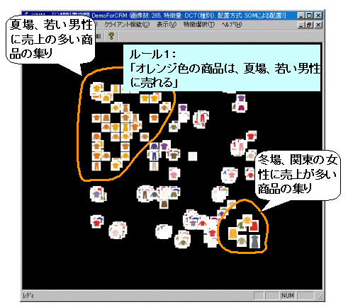 本技術をアパレル商品の市場調査に適用し、商品のデザインと売上などの属性データとの関連性を発見する実証実験を行いました。図1は、配置結果の画面例です。この例では、左上の部分に"夏場、若い男性に売上が多い"商品が、自動的に集められて配置されました。この部分の画像を見ると、"オレンジ色"の商品が多いことがわかるため、「オレンジ色の商品は夏場、若い男性によく売れる」という知識が発見できました。