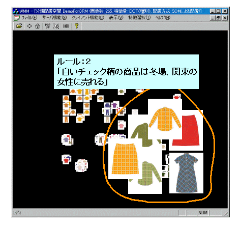 一方、図1の右下には、"冬場、関東の女性に売上が多い"商品が集まりました。これらの画像を手前に拡大表示し、より詳しく見てみると、図2のように"白いチェック柄が入った"商品が多いことがわかります。このことから「白いチェック柄の商品は、冬場、関東の女性によく売れる」という知識が発見できました。また、このようにして発見された知識がどの程度確からしいかを定量的に検証する作業も、本システムを用いて行うことができます。