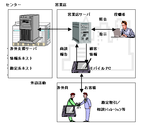 本システムは、渉外員の事務処理業務の効率化と顧客先での提案型セールスや顧客向けサービスの向上を同時に実現する各種機能を提供いたします。銀行の渉外担当者にペン入力のモバイルペンコンピュータ (注)を携帯させることで、集金業務だけでなく、住宅ローンのシミュレーションや新商品の紹介が、顧客先でタイムリーに行えるようになります。