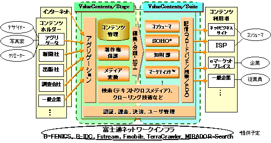 富士通は、「TerraCrawler」「MIRADOR-Search」などからなるサービスインフラにより「ValueContents」を支え、富士通グループ全体のコンテンツビジネスへの取り組みを推進します。